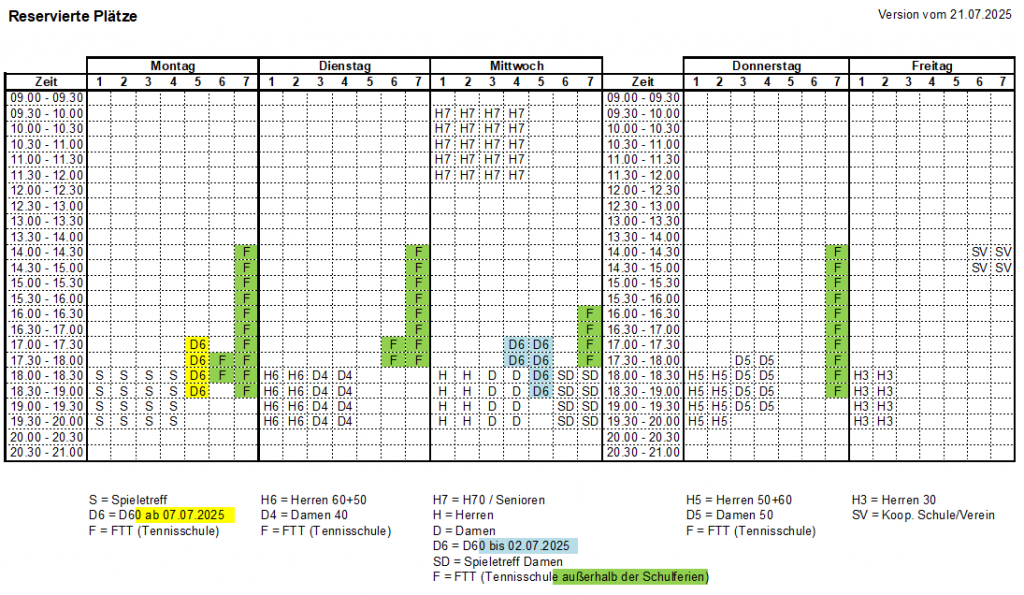 1. Oben die fixen Platzreservierungen, die die ganze Sommersaison über gelten (F gilt nur außerhalb der Schulferien)