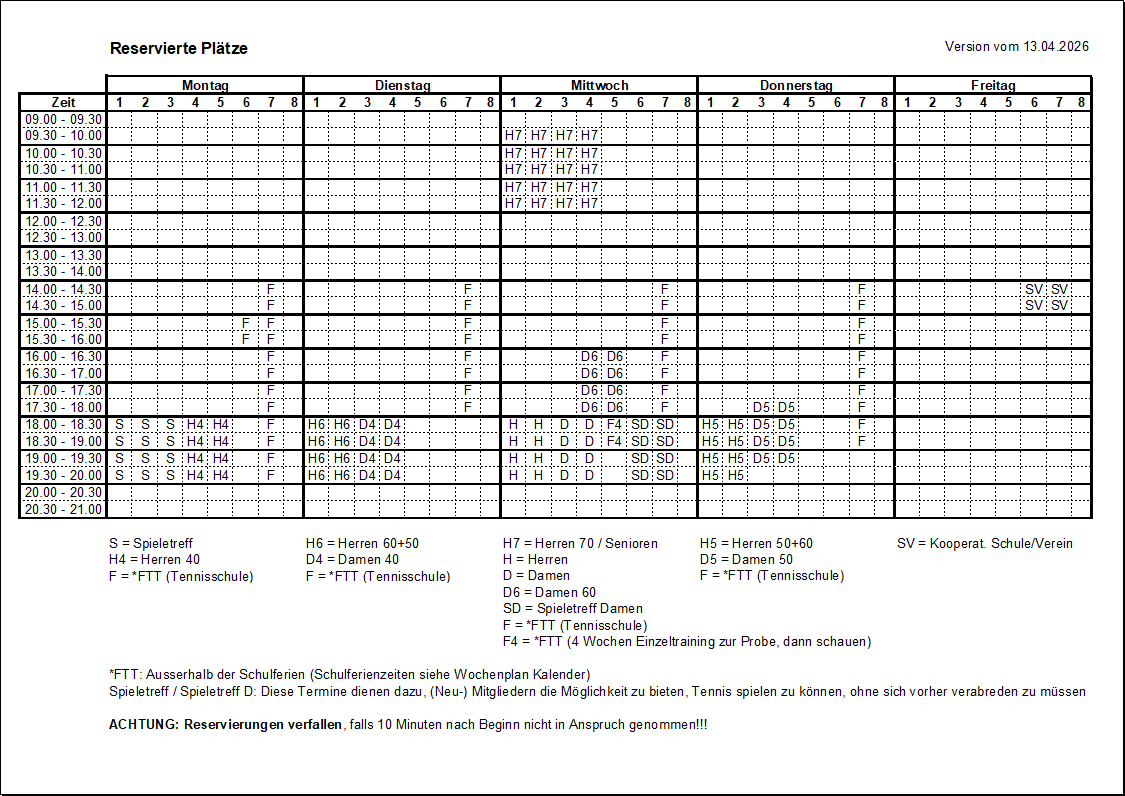 1. Oben die fixen Platzreservierungen, die die ganze Sommersaison über gelten (F gilt nur außerhalb der Schulferien)